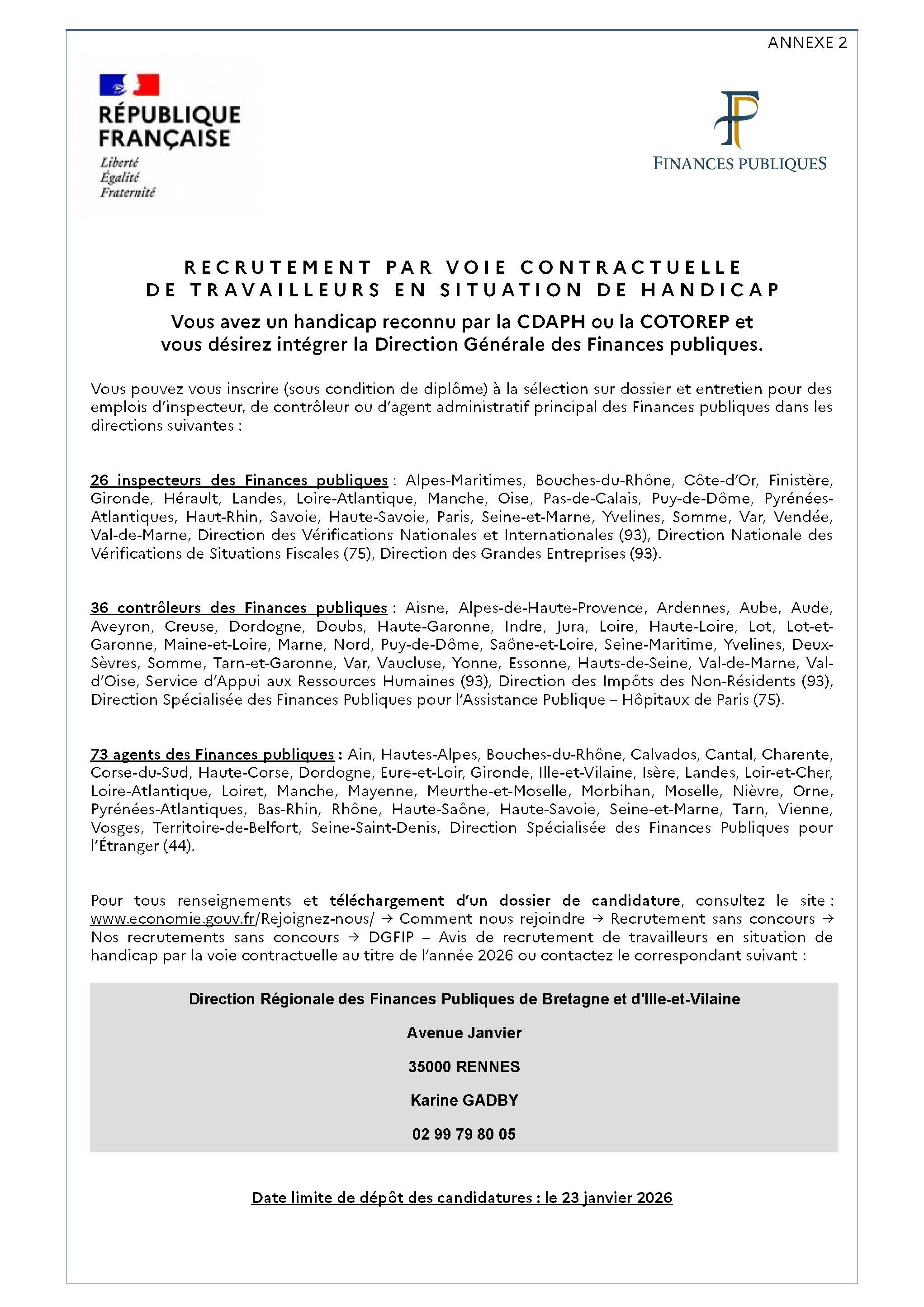Le dossier de candidature (annexes 3-A, 3-B et 3-C) sera téléchargé depuis le portail du Ministère de l’Économie, des Finances et de la Souveraineté industrielle et numérique ou  retiré par les candidats auprès des directions de recrutement : www.economie.gouv.fr/recrutement -> Rubrique Rejoignez-nous -> Nos recrutements sans concours ->Recrutement travailleurs en situation de handicap-> DGFIP -  avis de recrutement de travailleurs en situation de handicap par la voie contractuelle au titre de l'année 2026.