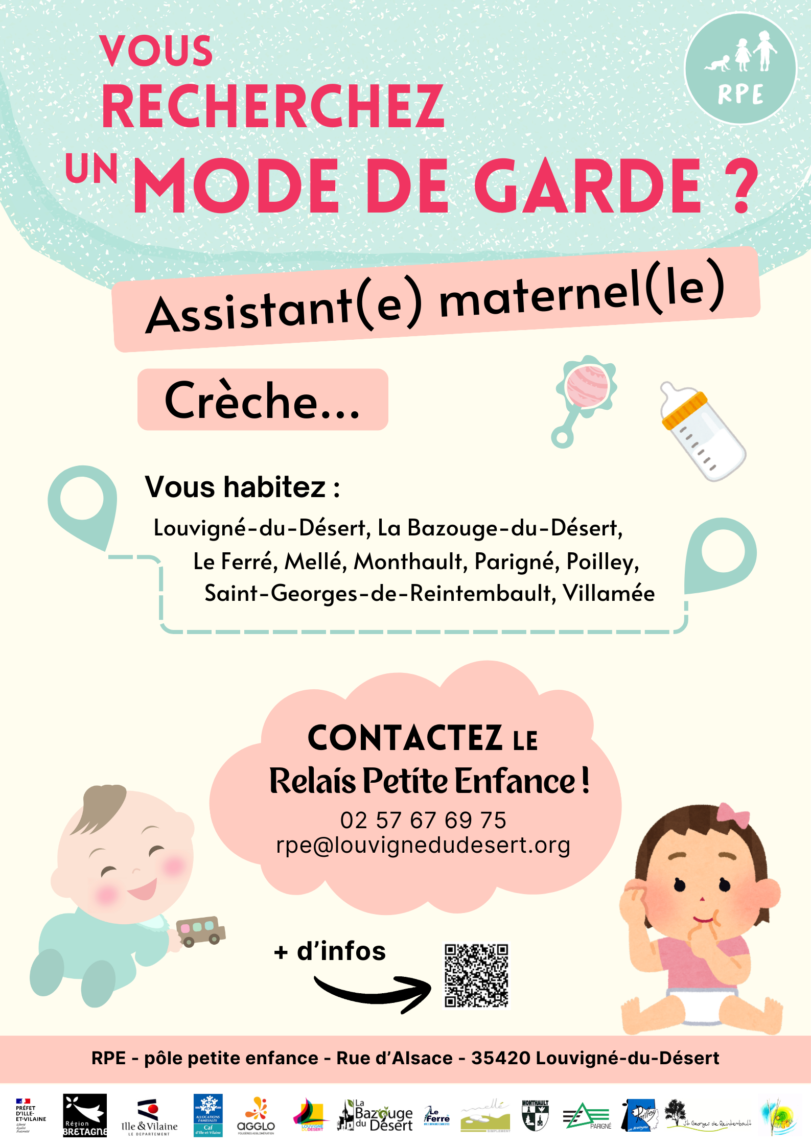 Contactez le Relais Petite Enfance au 02 57 67 69 75 ou par mail : rpe@louvignedudesert.org.