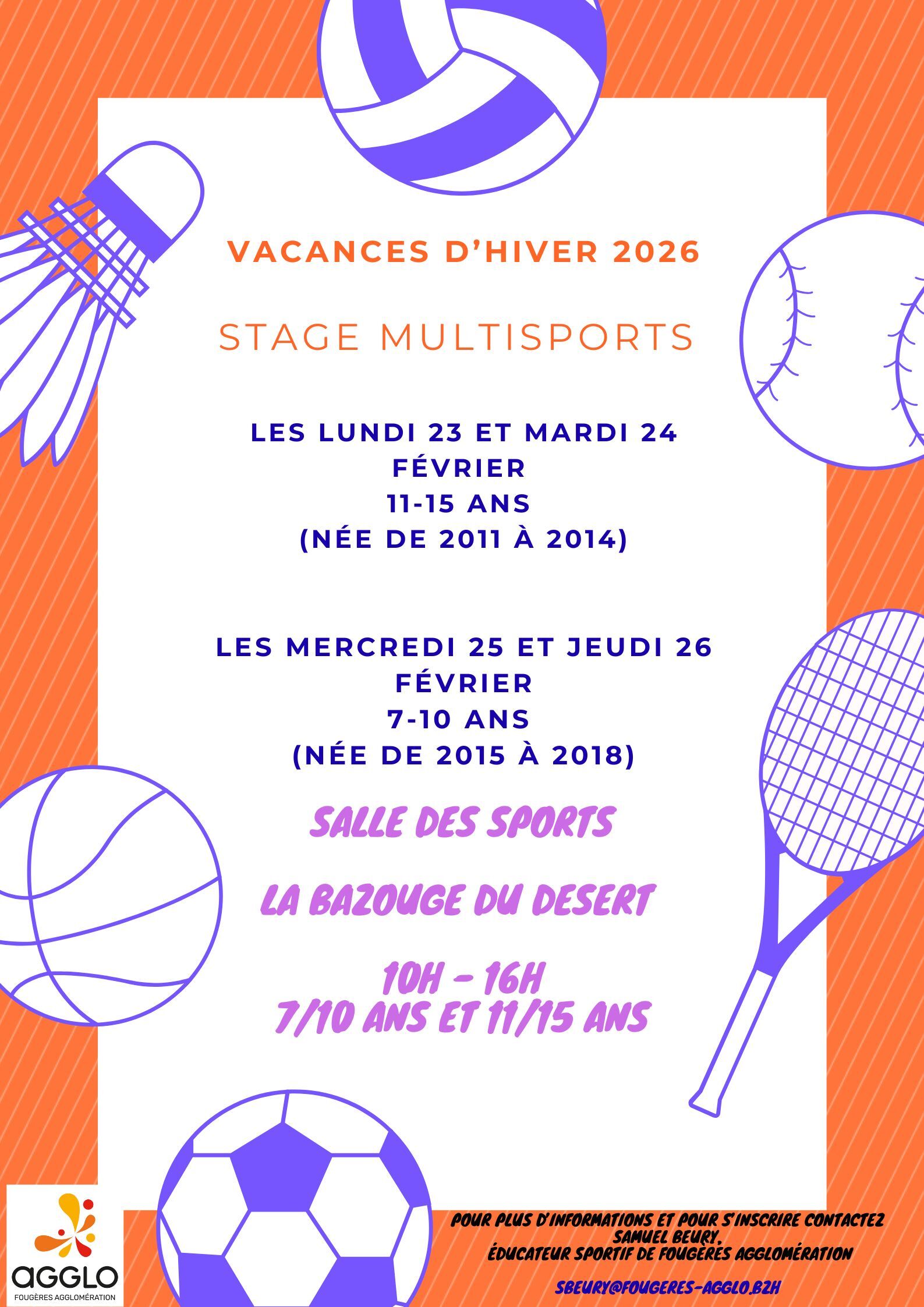 Stages MULTISPORTS vacances d'hiver 03/02/2026 Stages multisports à St Georges-de-Reintembault et à la Bazouge-du-Désert - GRATUIT - Inscription obligatoire ! Pour plus d’informations et pour s’inscrire contactez Samuel Beury, éducateur sportif de Fougères Agglomération : sbeury@fougeres-agglo.bzh. Suivant