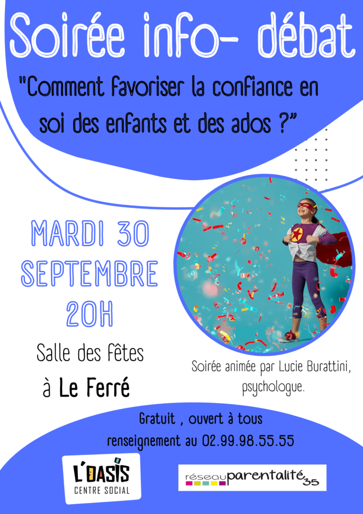 Soirées infos-débat - Adolescence 30 septembre 2025 Une soirée infos-débat sur le thème "Comment favoriser la confiance en soi des enfants et des ados" aura lieu le mardi 30 septembre à 20h à la salle des fêtes de Le Ferré. Précédant Suivant