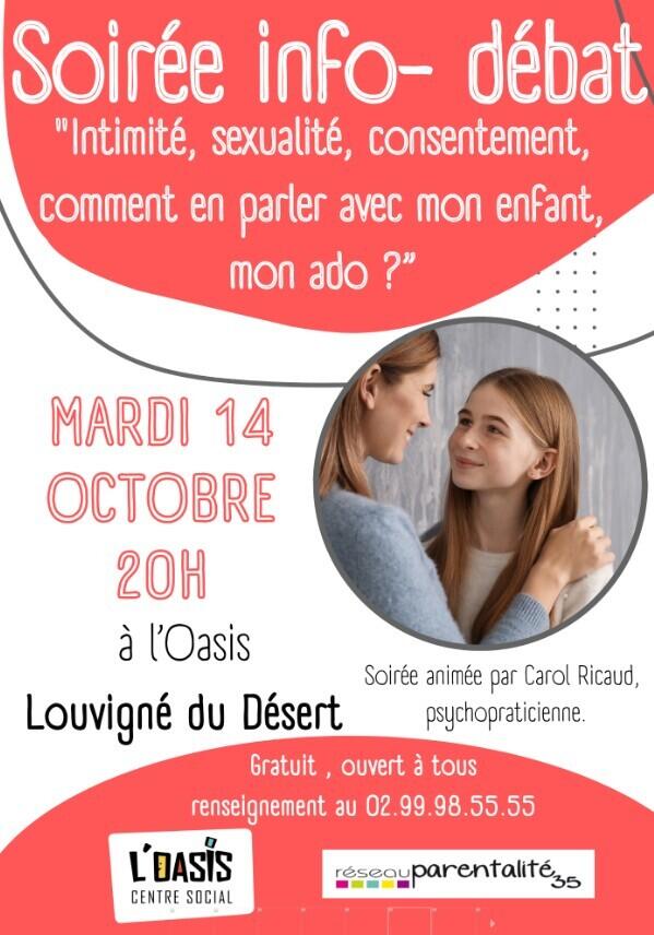 Soirées infos-débat autour de la parentalité 14 octobre 2025 L'Oasis vous invite à la soirée débat autour de la parentalité. Thème du 14 octobre : intimité, sexualité, consentement, comment en parler avec mon ado ? Précédant Suivant