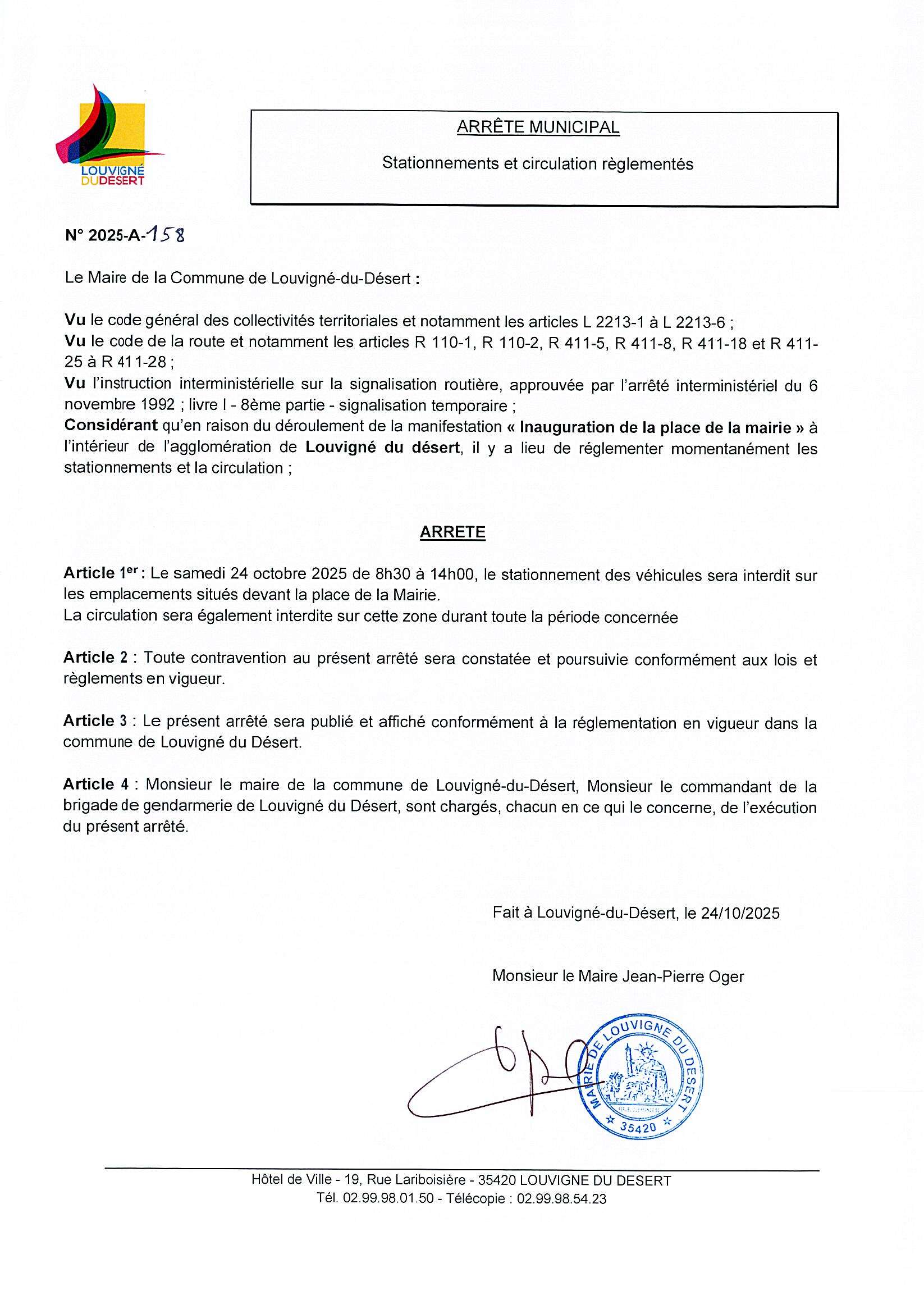 Parking mairie inaccessible - sam 25 octobre 24 octobre 2025 Le parking de la place devant la mairie sera inaccessible pour permettre le bon déroulement de l’inauguration de la place de la mairie. Il sera interdit de circuler et de stationner sur ce parking comme indiqué dans l'arrêté municipal. Précédant Suivant