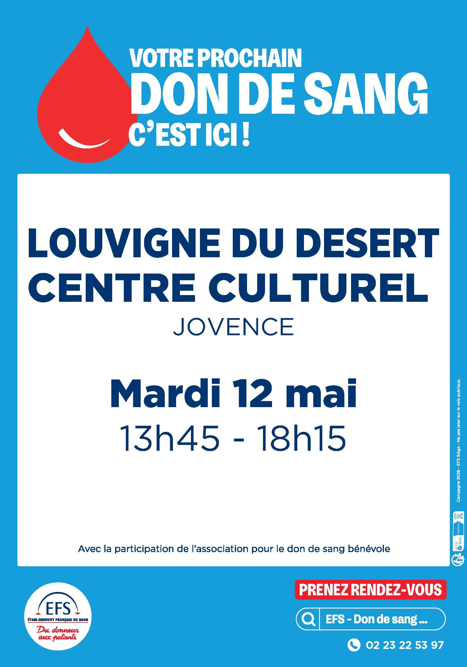 La prise de rendez-vous se fait en ligne : https://mon-rdv-dondesang.efs.sante.fr.