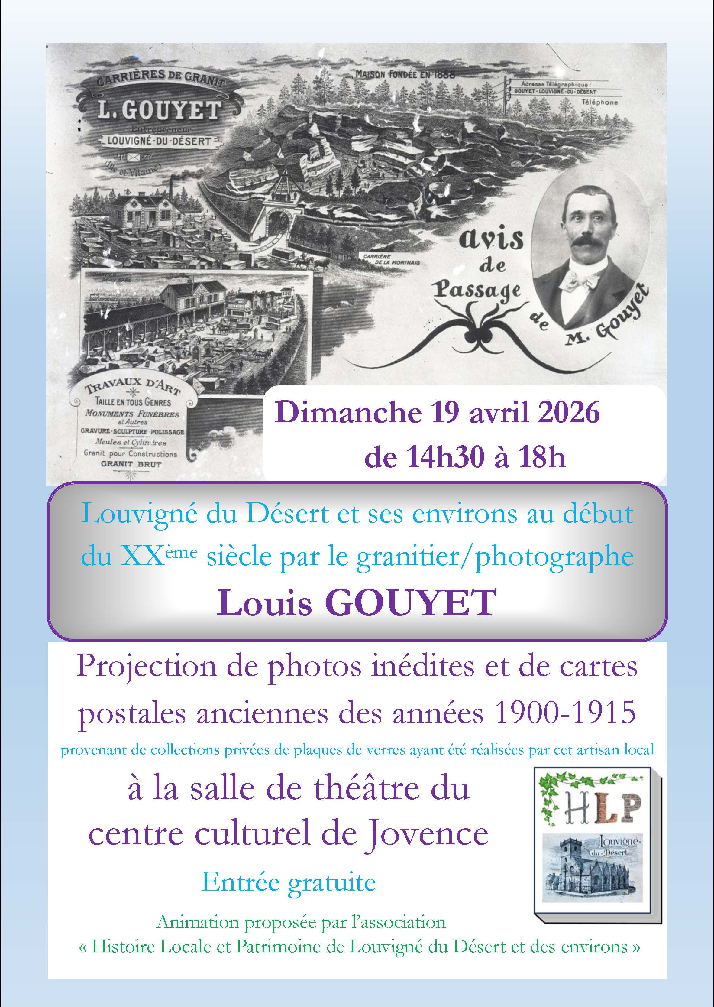 Le dimanche 19 avril 2026, à la salle de théâtre de l’espace culturel de Jovence, l’association « Histoire Locale et Patrimoine de Louvigné du désert et des environs » fera une projection de photos et de cartes postales des années 1910-1915 tirées de ces plaques. Le public pourra donc découvrir des clichés de Louvigné, des communes aux alentours, des vues inédites du Mont Saint Michel, de quelques châteaux à découvrir de la région et parfois de lieux connus mais beaucoup plus lointains. Quelques portraits et photo de famille y seront aussi présentés.