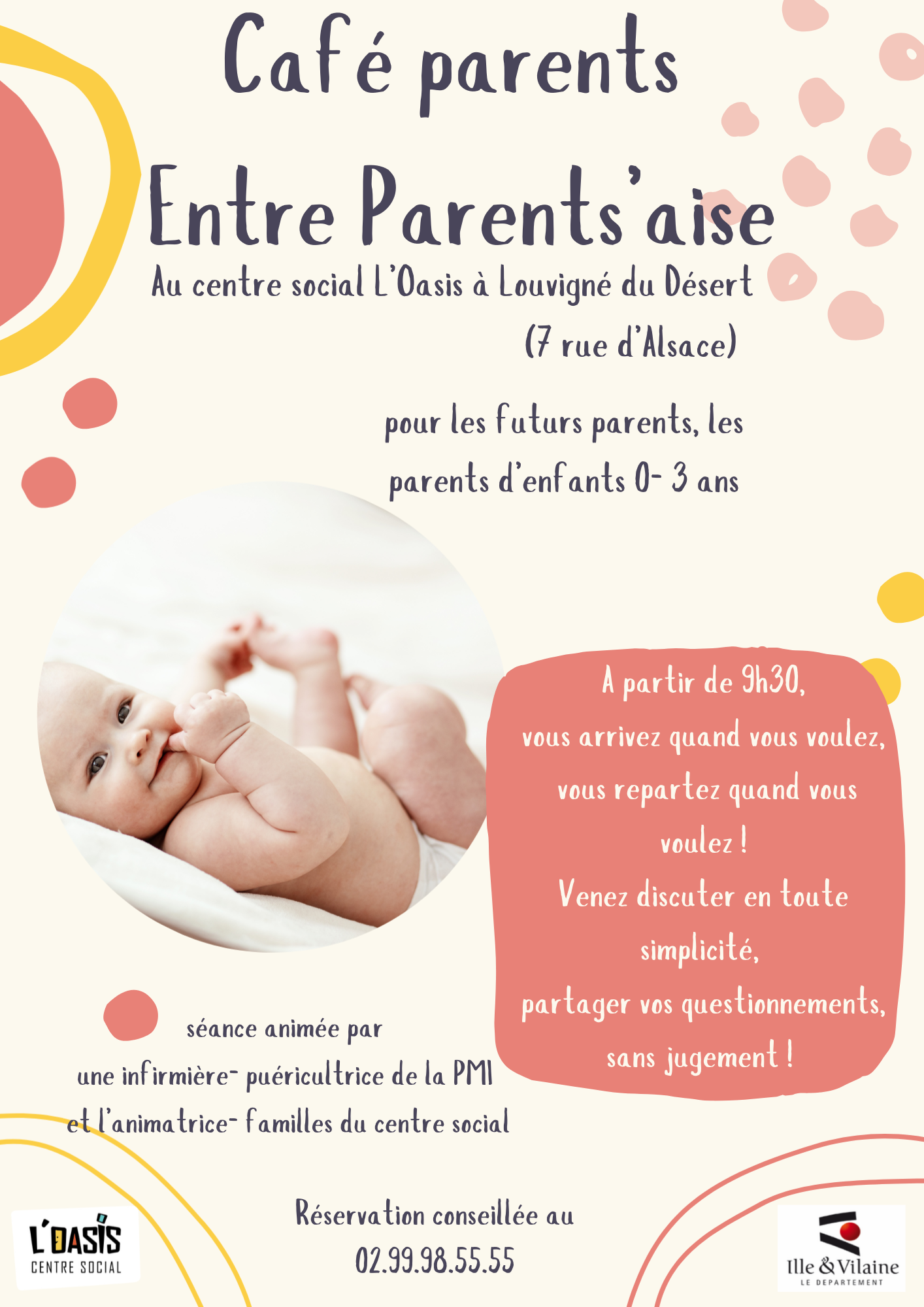 Café parents spécial futurs parents à L'Oasis 21 mai 2026 Café parents spécial futurs parents ou parents d'enfants âgés de 0 à 3 ans animé en partenariat avec les services de la PMI. Précédant Suivant